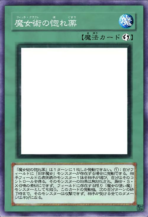 | 「魔女術の惚れ薬」は1ターンに1枚しか発動できない。①:自分フィールドに「旧き魔女」モンスターが存在する場合に発動できる。相手フィールドの表側表示モンスター1体を相手が選び、自分はそのコントロールを得る。そのモンスターの効果は無効化され、融合・S・X召喚の素材にできず、フィールドに存在する限り「魔女の使い魔」モンスターとしても扱う。このカードの発動後、次の自分ターンの終了時まで、そのモンスターは攻撃できず、相手が受ける全てのダメージは半分になる。 | |||