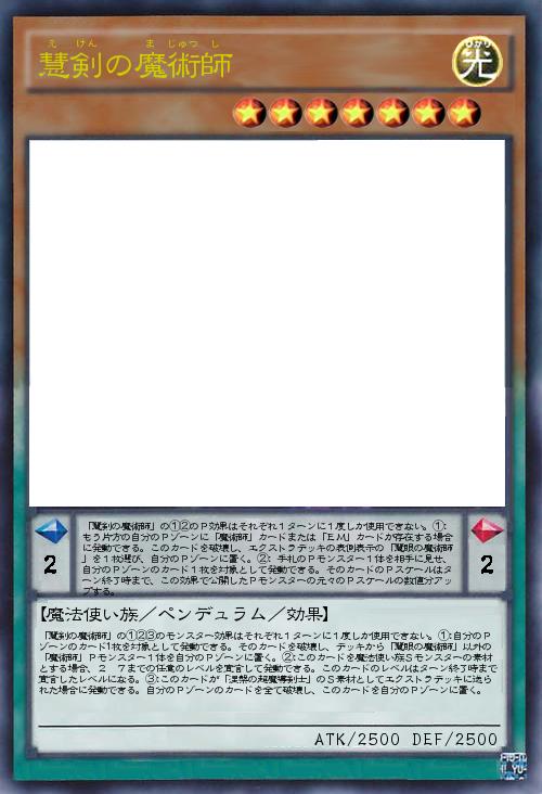| 「慧剣の魔術師」の①②のP効果はそれぞれ1ターンに1度しか使用できない。①:もう片方の自分のPゾーンに「魔術師」カードまたは「EM」カードが存在する場合に発動できる。このカードを破壊し、エクストラデッキの表側表示の「慧眼の魔術師」を1枚選び、自分のPゾーンに置く。②:手札のPモンスター1体を相手に見せ、自分のPゾーンのカード1枚を対象として発動できる。そのカードのPスケールはターン終了時まで、この効果で公開したPモンスターの元々のPスケールの数値分アップする。 | |||