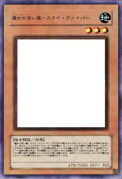 | 「魔女の使い魔-スライ・ヴァイパー」の①③の効果はそれぞれ1ターンに1度しか使用できない。①:自分フィールドのモンスターが「旧き魔女」モンスターのみの場合に発動できる。このカードを手札から特殊召喚する。この効果は相手ターンでも発動できる。②:このカードは相手プレイヤーに直接攻撃できる。その戦闘によって相手に与える戦闘ダメージは半分になる。③:このカードの攻撃で相手に戦闘ダメージを与えた時に発動できる。相手フィールドのモンスターの攻撃力はこのカードの攻撃で与えたダメージの数値分ダウンする。 | |||