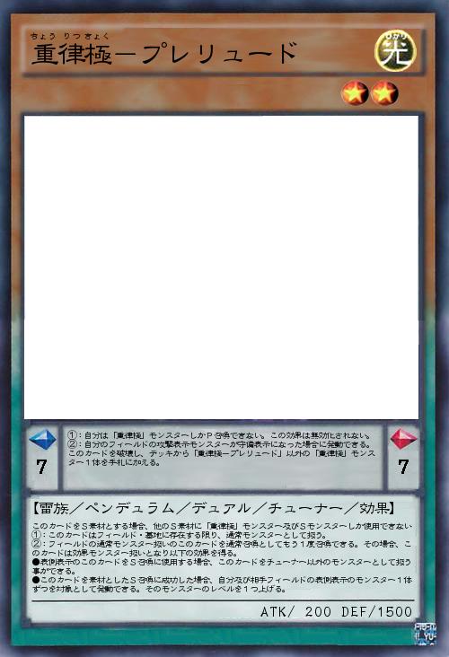 | ①:自分は「重律極」モンスターしかP召喚できない。この効果は無効化されない。 ②:自分のフィールドの攻撃表示モンスターが守備表示になった場合に発動できる。このカードを破壊し、デッキから「重律極-プレリュード」以外の「重律極」モンスター1体を手札に加える。 | |||