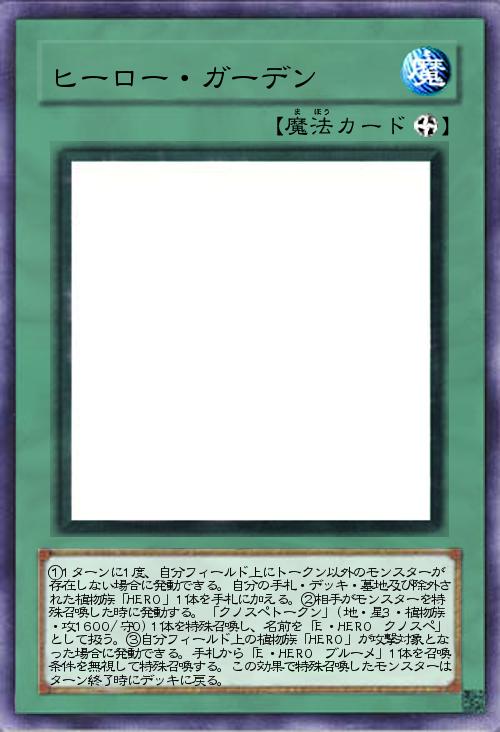 | ①1ターンに1度、自分フィールド上にトークン以外のモンスターが存在しない場合に発動できる。自分の手札・デッキ・墓地及び除外された植物族「HERO」1体を手札に加える。②相手がモンスターを特殊召喚した時に発動する。「クノスペトークン」(地・星3・植物族・攻1600/守0)1体を特殊召喚し、名前を「E・HERO クノスペ」として扱う。③自分フィールド上の植物族「HERO」が攻撃対象となった場合に発動できる。手札から「E・HERO ブルーメ」1体を召喚条件を無視して特殊召喚する。この効果で特殊召喚したモンスターはターン終了時にデッキに戻る。 | |||