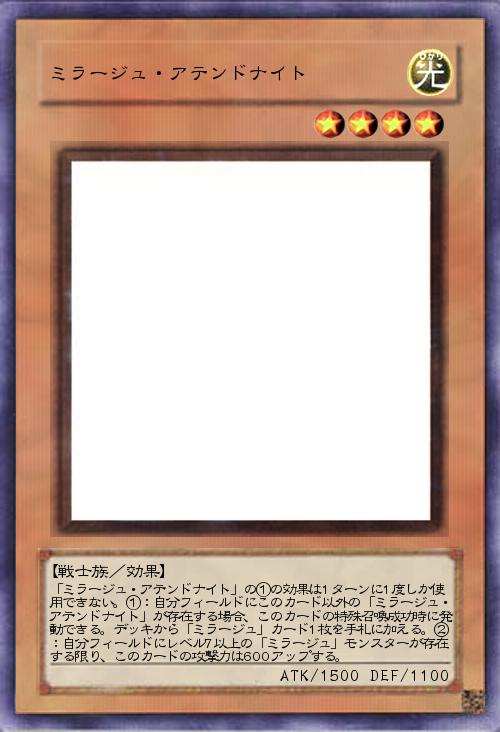 | 「ミラージュ・アテンドナイト」の①の効果は1ターンに1度しか使用できない。①:自分フィールドにこのカード以外の「ミラージュ・アテンドナイト」が存在する場合、このカードの特殊召喚成功時に発動できる。デッキから「ミラージュ」カード1枚を手札に加える。②:自分フィールドにレベル7以上の「ミラージュ」モンスターが存在する限り、このカードの攻撃力は600アップする。 | |||