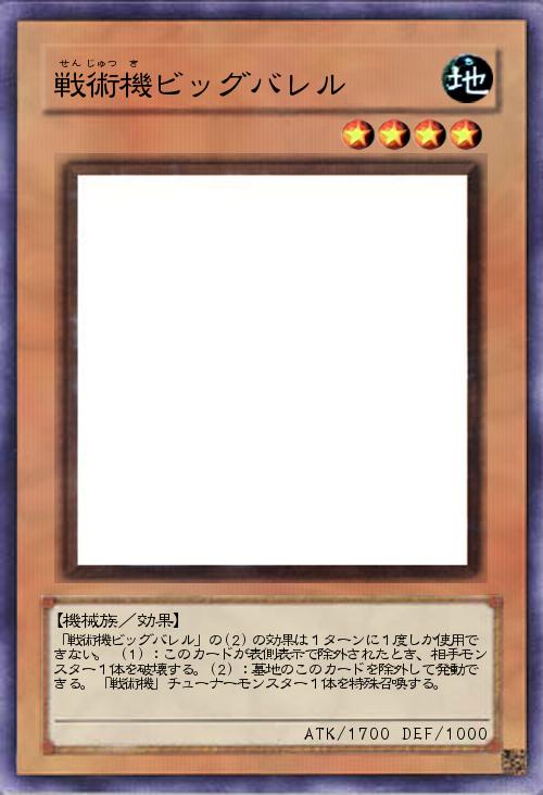 | 「戦術機ビッグバレル」の(2)の効果は1ターンに1度しか使用できない。 (1):このカードが表側表示で除外されたとき、相手モンスター1体を破壊する。(2):墓地のこのカードを除外して発動できる。「戦術機」チューナーモンスター1体を特殊召喚する。 | |||