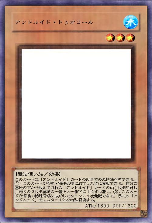 | このカードは「アンドルイド」カードの効果でのみ特殊召喚できる。①:このカードが召喚・特殊召喚に成功した時に発動できる。自分の墓地の下から数えて3枚の「アンドルイド」カードの内1枚を除外し、残りの2枚を墓地の一番上と一番下に1枚ずつ置く。②:このカードが召喚・特殊召喚に成功したターンに1度発動できる。手札の「アンドルイド」モンスター1体を特殊召喚する。 | |||