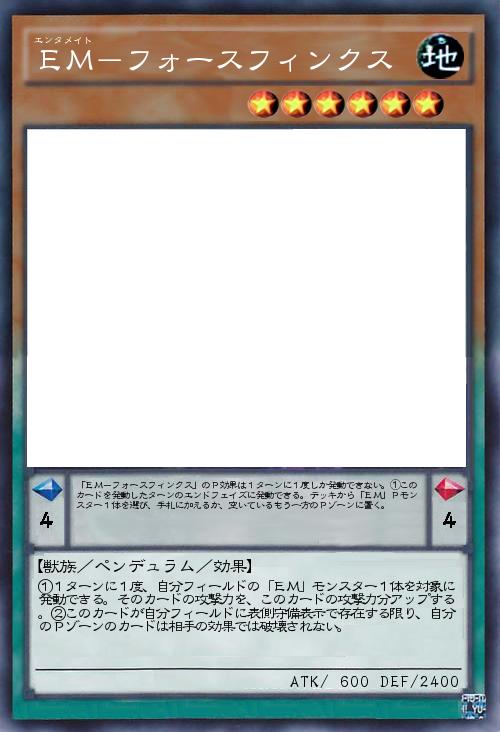 | 「EM-フォースフィンクス」のP効果は1ターンに1度しか発動できない。①このカードを発動したターンのエンドフェイズに発動できる。デッキから「EM」Pモンスター1体を選び、手札に加えるか、空いているもう一方のPゾーンに置く。 | |||