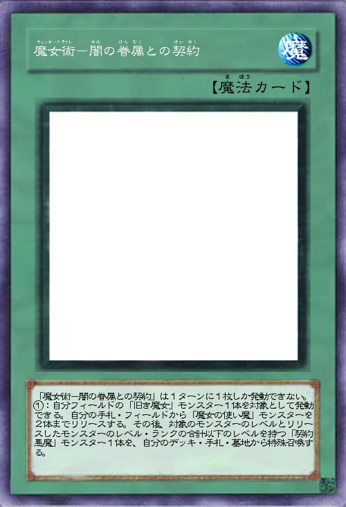 | 「魔女術-闇の眷属との契約」は1ターンに1枚しか発動できない。①:自分フィールドの「旧き魔女」モンスター1体を対象として発動できる。自分の手札・フィールドから「魔女の使い魔」モンスターを2体までリリースする。その後、対象のモンスターのレベルとリリースしたモンスターのレベル・ランクの合計以下のレベルを持つ「契約悪魔」モンスター1体を、自分のデッキ・手札・墓地から特殊召喚する。 | |||