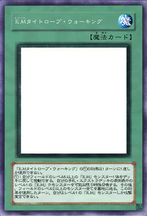 | 「EMタイトロープ・ウォーキング」の①の効果は1ターンに1度しか使用できない。 ①:自分フィールドのレベル5以上の「EM」モンスター1体をデッキに戻して発動できる。自分の手札・エクストラデッキの表側表示のレベル1の「EM」Pモンスターを可能な限り特殊召喚する。その後、フィールドのレベル2以上のモンスター全てを墓地に送る。この効果を使用したターン、自分はレベル1の「EM」モンスターしか攻撃宣言できない。 | |||
