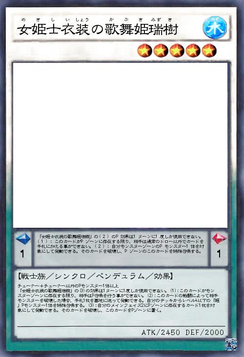 | 「女姫士衣装の歌舞姫瑞樹」の(2)のP効果は1ターンに1度しか使用できない。(1):このカードがPゾーンに存在する限り、相手は通常のドロー以外でカードを手札に加える事ができない。(2):自分モンスターゾーンのPモンスター1体を対象にして発動できる。そのカードを破壊し、Pゾーンのこのカードを特殊召喚する。 | |||