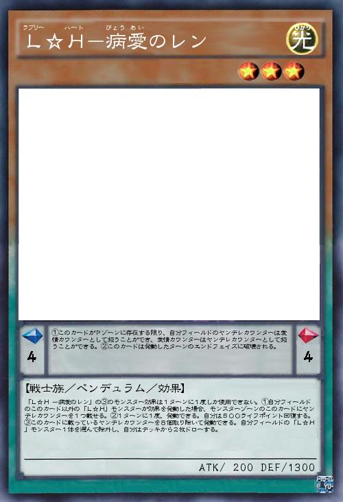 | 「L☆H -病愛のレン」の③のモンスター効果は1ターンに1度しか使用できない。①自分フィールドのこのカード以外の「L☆H」モンスターが効果を発動した場合、モンスターゾーンのこのカードにヤンデレカウンターを1つ載せる。②1ターンに1度、発動できる。自分は500ライフポイント回復する。③このカードに載っているヤンデレカウンターを8個取り除いて発動できる。自分フィールドの「L☆H」モンスター1体を選んで除外し、自分はデッキから2枚ドローする。 | |||