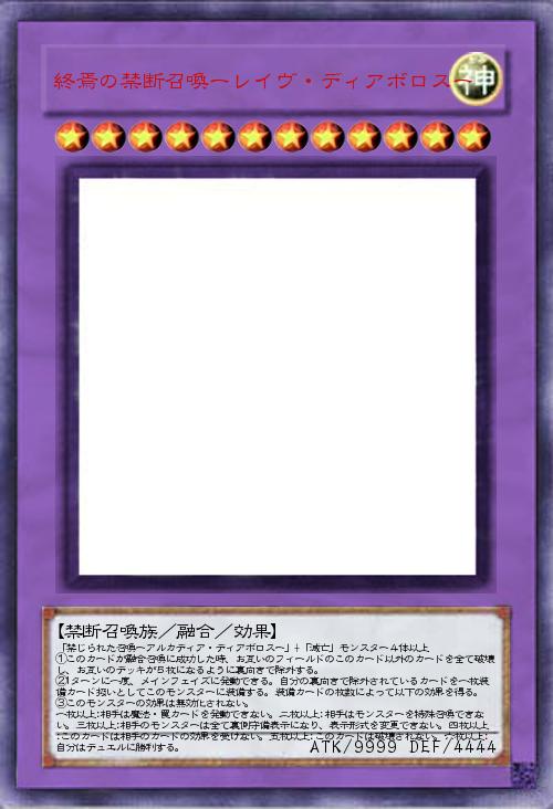 | 「禁じられた召喚ーアルカディア・ディアボロスー」+「滅亡」モンスター4体以上 ①このカードが融合召喚に成功した時、お互いのフィールドのこのカード以外のカードを全て破壊し、お互いのデッキが5枚になるように裏向きで除外する。 ②1ターンに一度、メインフェイズに発動できる。自分の裏向きで除外されているカードを一枚装備カード扱いとしてこのモンスターに装備する。装備カードの枚数によって以下の効果を得る。 ③このモンスターの効果は無効化されない。 一枚以上:相手は魔法・罠カードを発動できない。二枚以上:相手はモンスターを特殊召喚できない。三枚以上:相手のモンスターは全て裏側守備表示になり、表示形式を変更できない。四枚以上:このカードは相手のカードの効果を受けない。五枚以上:このカードは破壊されない。六枚以上:自分はデュエルに勝利する。 | |||