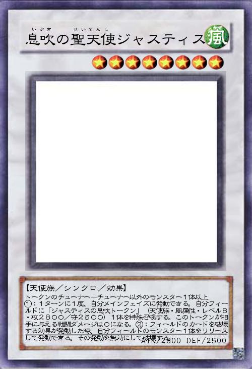 | トークンのチューナー+チューナー以外のモンスター1体以上 ①:1ターンに1度、自分メインフェイズに発動できる。自分フィールドに「ジャスティスの息吹トークン」(天使族・風属性・レベル8・攻2800/守2500)1体を特殊召喚する。このトークンが相手に与える戦闘ダメージは0になる。②:フィールドのカードを破壊する効果が発動した時、自分フィールドのモンスター1体をリリースして発動できる。その発動を無効にして破壊する。 | |||