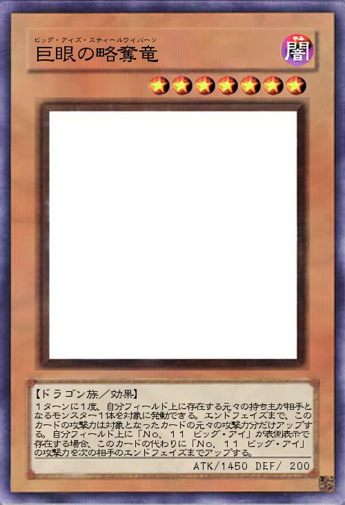 | 1ターンに1度、自分フィールド上に存在する元々の持ち主が相手となるモンスター1体を対象に発動できる。エンドフェイズまで、このカードの攻撃力は対象となったカードの元々の攻撃力分だけアップする。自分フィールド上に「No.11 ビッグ・アイ」が表側表示で存在する場合、このカードの代わりに「No.11 ビッグ・アイ」の攻撃力を次の相手のエンドフェイズまでアップする。 | |||