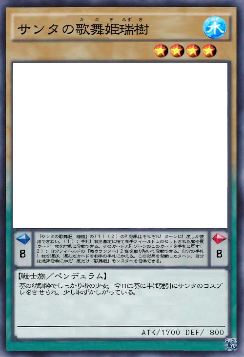 | 「サンタの歌舞姫 瑞樹」の(1)(2)のP効果はそれぞれ1ターンに1度しか使用できない。(1):手札1枚を墓地に捨て相手フィールド上のセットされた魔法罠カード1枚を対象に発動できる。そのカードとPゾーンのこのカードを手札に戻す(2):自分フィールドの「舞カウンター」2個を取り除いて発動できる。自分の手札1枚を選び、選んだカードを相手の手札に加える。この効果を発動したターン、自分は通常召喚に加え1度だけ「歌舞姫」モンスターを召喚できる。 | |||