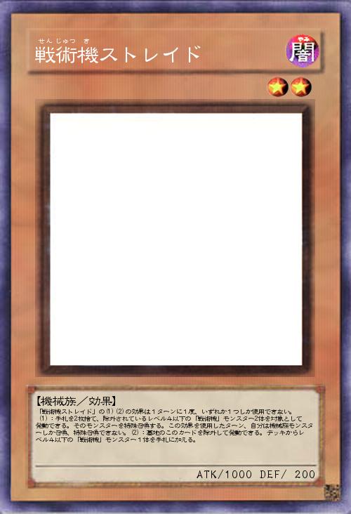 | 「戦術機ストレイド」の(1)(2)の効果は1ターンに1度、いずれか1つしか使用できない。 (1):手札を2枚捨て、除外されているレベル4以下の「戦術機」モンスター2体を対象として発動できる。そのモンスターを特殊召喚する。この効果を使用したターン、自分は機械族モンスターしか召喚、特殊召喚できない。(2):墓地のこのカードを除外して発動できる。デッキからレベル4以下の「戦術機」モンスター1体を手札に加える。 | |||