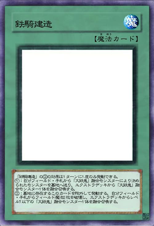 | 「鉄騎建造」の②の効果は1ターンに1度のみ発動できる。 ①:自分フィールド・手札から「大鉄鬼」融合モンスターにより決められたモンスターを墓地へ送り、エクストラデッキから「大鉄鬼」融合モンスター1体を融合召喚する。 ②:墓地に存在するこのカードを除外して発動する。自分フィールド・手札からフィールド魔法2枚を破壊し、エクストラデッキからレベル7以下の「大鉄鬼」融合モンスター1体を融合召喚する。 | |||