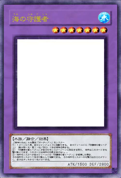| 「海神の巫女」+水属性「ガーディアン」モンスター ①:1ターンに1度、自分メインフェイズに発動できる。 自分フィールドに「守護者の盾トークン」(戦士族・光・星1・攻/守0)1体を特殊召喚する。 ②:「守護者の盾トークン」が自分のモンスターゾーンに存在する限り、 相手はこのカードを攻撃対象にできず、このカードは相手の効果を受けない。。 ③:相手モンスターが自分フィールドの「守護者の盾トークン」を破壊した場合、 その相手モンスター1体を対象として発動できる。 その相手モンスターの攻撃力は800ダウンし、自分はデッキから1枚ドローする。 | |||