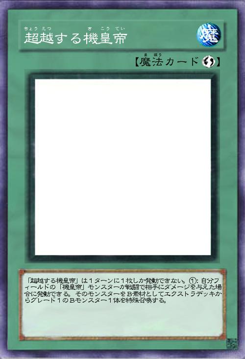 | 「超越する機皇帝」は1ターンに1枚しか発動できない。①:自分フィールドの「機皇帝」モンスターが戦闘で相手にダメージを与えた場合に発動できる。そのモンスターをB素材としてエクストラデッキからグレード1のBモンスター1体を特殊召喚する。 | |||