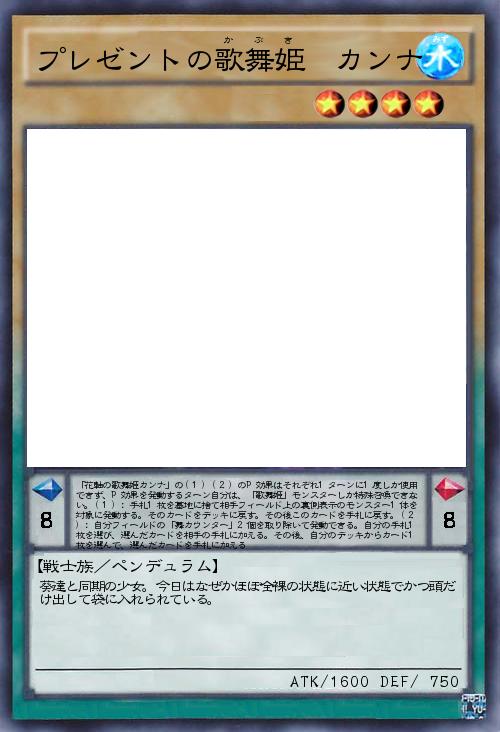 | 「花軸の歌舞姫カンナ」の(1)(2)のP効果はそれぞれ1ターンに1度しか使用できず、P効果を発動するターン自分は、「歌舞姫」モンスターしか特殊召喚できない。(1):手札1枚を墓地に捨て相手フィールド上の裏側表示のモンスター1体を対象に発動する。そのカードをデッキに戻す。その後このカードを手札に戻す。(2):自分フィールドの「舞カウンター」2個を取り除いて発動できる。自分の手札1枚を選び、選んだカードを相手の手札に加える。その後、自分のデッキからカード1枚を選んで、選んだカードを手札に加える | |||