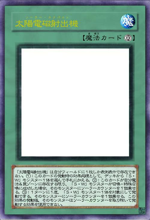 | 「太陽電磁射出機」は自分フィールドに1枚しか表側表示で存在できない。①:このカードの発動時の効果処理として、デッキから「S・W」モンスター1体を選んで手札に加える。②:このカードが自分魔法&罠ゾーンに存在する限り、「S・W」モンスターが召喚・特殊召喚に成功した場合、そのモンスターにソーラーカウンターを1個乗せる。③:1ターンに1度、「S・W」モンスター1体を対象にして発動できる。そのモンスターにソーラーカウンターを1個乗せる。この効果の発動後、そのモンスターはソーラーカウンターを取り除いて発動する効果を使用できない。 | |||