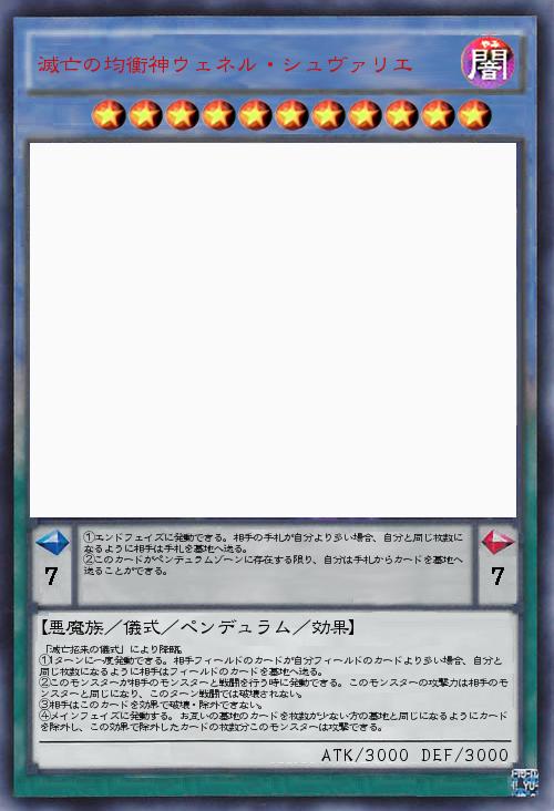 | 「滅亡招来の儀式」により降臨。 ①1ターンに一度発動できる。相手フィールドのカードが自分フィールドのカードより多い場合、自分と同じ枚数になるように相手はフィールドのカードを墓地へ送る。 ②このモンスターが相手のモンスターと戦闘を行う時に発動できる。このモンスターの攻撃力は相手のモンスターと同じになり、このターン戦闘では破壊されない。 ③相手はこのカードを効果で破壊・除外できない。 ④メインフェイズに発動する。お互いの墓地のカードを枚数が少ない方の墓地と同じになるようにカードを除外し、この効果で除外したカードの枚数分このモンスターは攻撃できる。 | |||