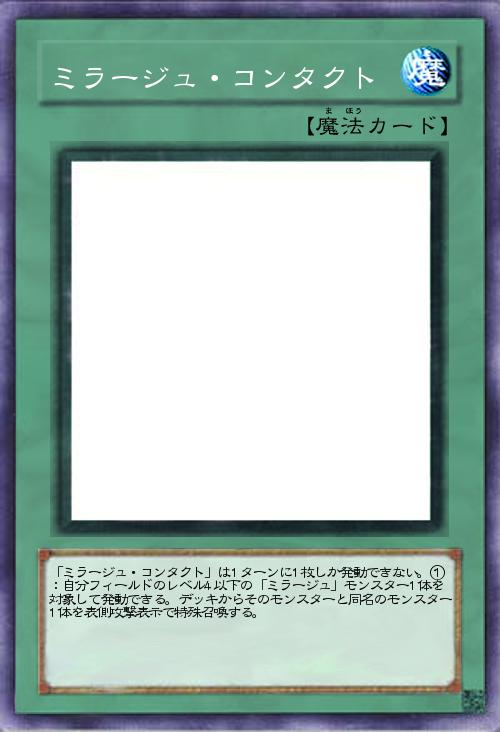 | 「ミラージュ・コンタクト」は1ターンに1枚しか発動できない。①:自分フィールドのレベル4以下の「ミラージュ」モンスター1体を対象して発動できる。デッキからそのモンスターと同名のモンスター1体を表側攻撃表示で特殊召喚する。 | |||