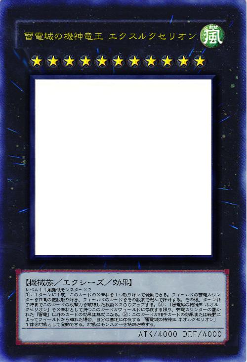 | レベル11風属性モンスター×2 ①:1ターンに1度、このカードのX素材を1つ取り除いて発動できる。フィールドの帯電カウンターを任意の個数取り除き、フィールドのカードをその数まで選んで除外する。その後、ターン終了時までこのカードの攻撃力を破壊した枚数×200アップする。②:「雷電城の機神王 ネオルクセリオン」をX素材として持つこのカードがフィールドに存在する限り、帯電カウンターの置かれた「雷電」以外のカードの効果は無効になる。③:このカードが相手カードの効果または戦闘によってフィールドから離れた場合、自分の墓地に存在する「雷電城の機神王 ネオルクセリオン」1体を対象として発動できる。対象のモンスターを特殊召喚する。 | |||