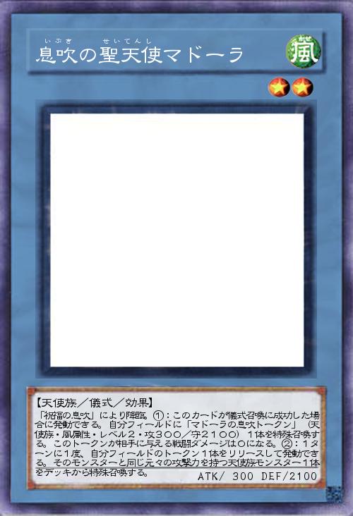 | 「祝福の息吹」により降臨。①:このカードが儀式召喚に成功した場合に発動できる。自分フィールドに「マドーラの息吹トークン」(天使族・風属性・レベル2・攻300/守2100)1体を特殊召喚する。このトークンが相手に与える戦闘ダメージは0になる。②:1ターンに1度、自分フィールドのトークン1体をリリースして発動できる。そのモンスターと同じ元々の攻撃力を持つ天使族モンスター1体をデッキから特殊召喚する。 | |||