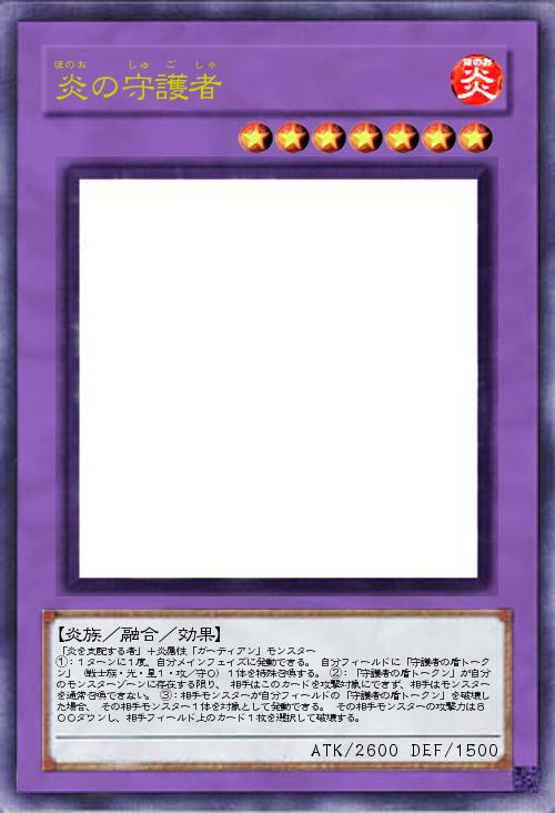 | 「炎を支配する者」+炎属性「ガーディアン」モンスター ①:1ターンに1度、自分メインフェイズに発動できる。 自分フィールドに「守護者の盾トークン」(戦士族・光・星1・攻/守0)1体を特殊召喚する。 ②:「守護者の盾トークン」が自分のモンスターゾーンに存在する限り、 相手はこのカードを攻撃対象にできず、相手はモンスターを通常召喚できない。 ③:相手モンスターが自分フィールドの「守護者の盾トークン」を破壊した場合、 その相手モンスター1体を対象として発動できる。 その相手モンスターの攻撃力は800ダウンし、相手フィールド上のカード1枚を選択して破壊する。 | |||