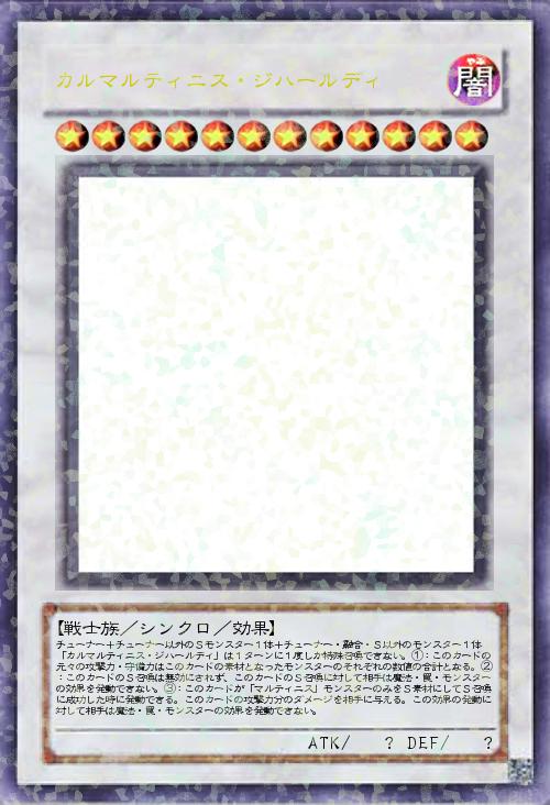 | チューナー+チューナー以外のSモンスター1体+チューナー・融合・S以外のモンスター1体 「カルマルティニス・ジハールディ」は1ターンに1度しか特殊召喚できない。①:このカードの元々の攻撃力・守備力はこのカードの素材となったモンスターのそれぞれの数値の合計となる。②:このカードのS召喚は無効にされず、このカードのS召喚に対して相手は魔法・罠・モンスターの効果を発動できない。③:このカードが「マルティニス」モンスターのみをS素材にしてS召喚に成功した時に発動できる。このカードの攻撃力分のダメージを相手に与える。この効果の発動に対して相手は魔法・罠・モンスターの効果を発動できない。 | |||