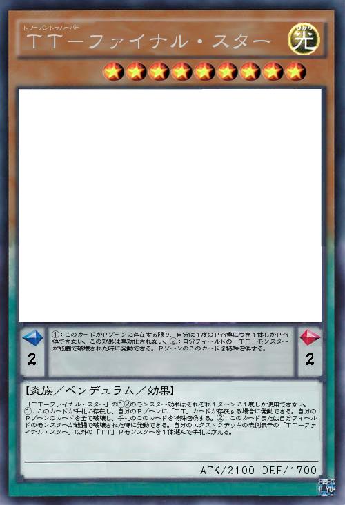 | 「TT-ファイナル・スター」の①②のモンスター効果はそれぞれ1ターンに1度しか使用できない。 ①:このカードが手札に存在し、自分のPゾーンに「TT」カードが存在する場合に発動できる。自分のPゾーンのカードを全て破壊し、手札のこのカードを特殊召喚する。②:このカードまたは自分フィールドのモンスターが戦闘で破壊された時に発動できる。自分のエクストラデッキの表側表示の「TT-ファイナル・スター」以外の「TT」Pモンスターを1体選んで手札に加える。 | |||