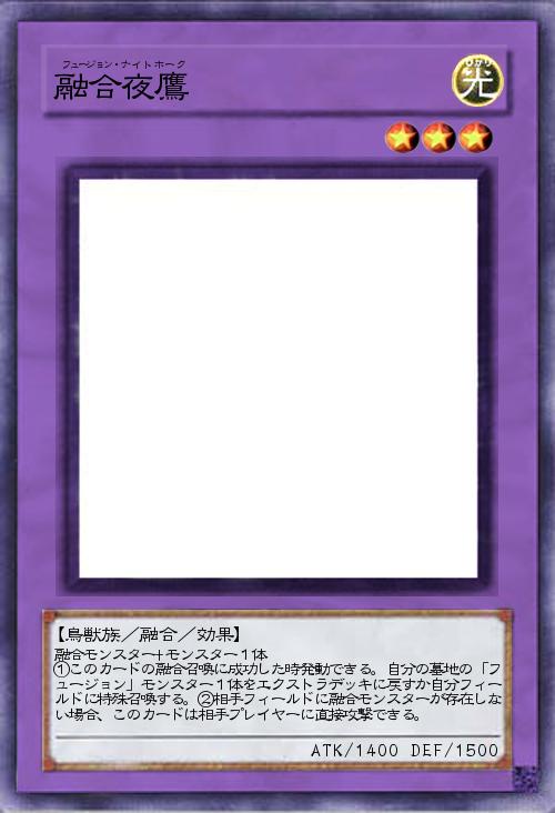 | 融合モンスター+モンスター1体 ①このカードの融合召喚に成功した時発動できる。自分の墓地の「フュージョン」モンスター1体をエクストラデッキに戻すか自分フィールドに特殊召喚する。②相手フィールドに融合モンスターが存在しない場合、このカードは相手プレイヤーに直接攻撃できる。 | |||
