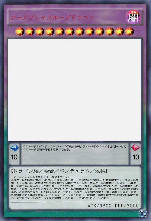 | 「アークブレイブドラゴン」+「希望皇ホープ」 このカードが特殊召喚時、自分のデッキの上からカードを5枚まで確認し、好きな順番でデッキの上に戻す。1デュエルに一度だけ手札を全て捨てて発動できる。ドローするカードの種類(モンスター・魔法・罠)を当てる。自分のデッキからカードを1枚ドローして、お互いに確認し宣言したカードの種類だった場合、そのカードを手札に加える。宣言したカードの種類以外のカードをドローするまでこの効果を繰り返す。この効果でドローした数x1000アップする。このカードを相手の魔法・罠・効果モンスターの効果の対象にする事はできない。モンスターゾーンのこのカードが戦闘・効果で破壊された場合に発動できる。自分のPゾーンのカードを全て破壊し、このカードを自分のPゾーンに置く。 | |||