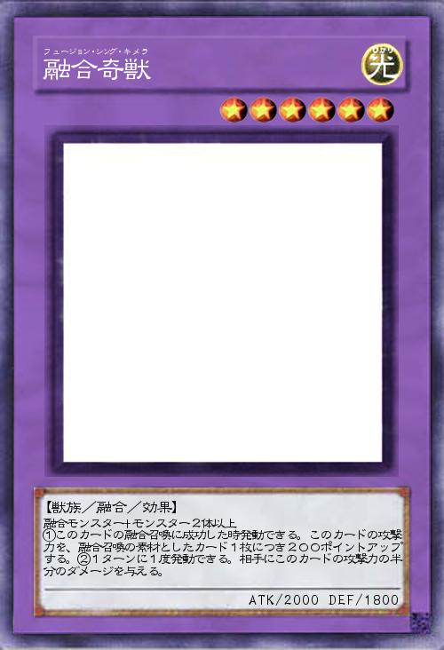 | 融合モンスター+モンスター2体以上 ①このカードの融合召喚に成功した時発動できる。このカードの攻撃力を、融合召喚の素材としたカード1枚につき200ポイントアップする。②1ターンに1度発動できる。相手にこのカードの攻撃力の半分のダメージを与える。 | |||