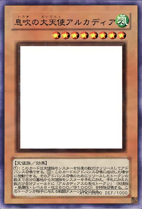 | ①:このカードは天使族モンスターを任意の数だけリリースしてアドバンス召喚できる。②:このカードのアドバンス召喚に成功した場合に発動できる。そのアドバンス召喚のためにリリースしたトークンの数まで自分の墓地から天使族モンスターを手札に加え、手札に加えた数だけ自分フィールドに「アルカディアスの息吹トークン」(天使族・風属性・レベル8・攻2800/守1000)を特殊召喚する。このトークンが相手に与える戦闘ダメージは0になる。 | |||