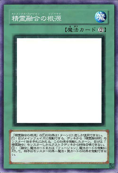 | 「精霊融合の根源」の①の効果は1ターンに1度しか使用できない。 ①:自分メインフェイズに発動できる。デッキから「精霊融合師」モンスター1体を手札に加える。この効果を発動したターン、自分は「精霊融合」モンスターしかエクストラデッキから特殊召喚できない。 ②:「融合」魔法カードまたは「フュージョン」魔法カードの発動に対して、相手はモンスター効果・魔法・罠カードの効果を発動できない。 | |||