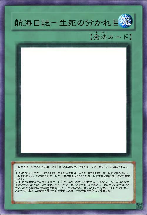 | 「航海日誌ー生死の分かれ目」の(1)(2)の効果はそれぞれ1ターンに一度ずつしか発動出来ない。 (1):自分のデッキから「航海日誌ー生死の分かれ目」以外の「航海日誌」カードを3種類選択し、相手に見せる。相手はそのカードから1枚選択し自分はそのカードを手札に加え残りは全て墓地へ送る。 (2):自分の墓地に存在するこのカードをゲームから除外し発動する。自分フィールド上に存在する通常モンスターの「ゴールデンパイレーツ」モンスターを1体を選択し、そのモンスターは効果モンスターとなり以下の効果を得る。 ・1ターンに一度、相手が「ゴールデンパイレーツ」モンスターを対象とした魔法・罠カードを発動した時、その発動を無効にし破壊する。 | |||