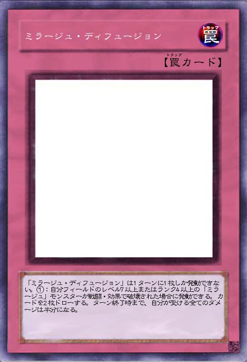 | 「ミラージュ・ディフュージョン」は1ターンに1枚しか発動できない。①:自分フィールドのレベル7以上またはランク4以上の「ミラージュ」モンスターが戦闘・効果で破壊された場合に発動できる。カードを2枚ドローする。ターン終了時まで、自分が受ける全てのダメージは半分になる。 | |||