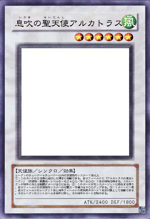 | トークンのチューナー+チューナー以外の天使族モンスター1体以上 ①:このカードのS召喚に成功した場合に発動できる。自分フィールドに「アルカトラスの息吹トークン」(天使族・風属性・レベル6・攻2400/守1800)1体を特殊召喚する。このトークンが相手に与える戦闘ダメージは0になる。②:このカードがモンスターゾーンに存在する限り、自分フィールドの天使族モンスターの攻撃力・守備力は300アップする。③:1ターンに1度、自分フィールドのトークン1体と相手フィールドの表側表示カード1枚を対象として発動できる。そのトークンのコントロールを相手に移し、その相手のカードを除外する。 | |||