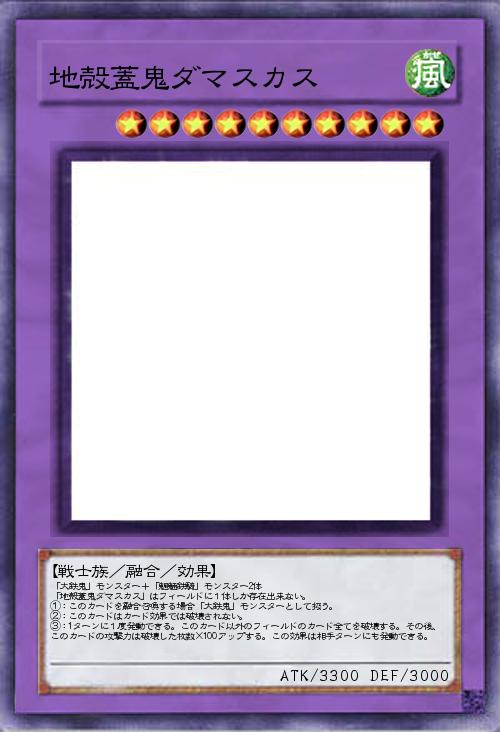 | 「大鉄鬼」モンスター+「魍魎鉄騎」モンスター2体 「地殻蓋鬼ダマスカス」はフィールドに1体しか存在出来ない。 ①:このカードを融合召喚する場合「大鉄鬼」モンスターとして扱う。 ②:このカードはカード効果では破壊されない。 ③:1ターンに1度発動できる。このカード以外のフィールドのカード全てを破壊する。その後、このカードの攻撃力は破壊した枚数×100アップする。この効果は相手ターンにも発動できる。 | |||