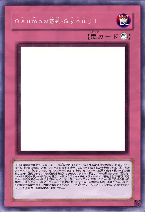 | 「Osumoの審判-Gyouji」の②の効果は1ターンに1度しか使用できない。自分フィールドに「Osumo」Xモンスターが存在する場合、このカードは手札から発動できる。①:自分フィールドに「Osumo」モンスターが存在する場合、モンスターの効果・魔法・罠カードが発動した時に発動できる。 その発動を無効にし持ち主のデッキに戻す。この効果でデッキに戻したカードが魔法・罠カードだった場合、お互いのデッキ・手札・フィールド・墓地を全て確認してそのカード及び同名カードを全て除外する。②:自分メインフェイズ時、このカードが自分の墓地に存在し、自分フィールドに「Osumoの聖域-Dohyou」が存在する時、手札からカードを1枚捨てて発動できる。墓地に存在するこのカードを自分フィールドにセットする。この効果でセットしたこのカードは発動後、除外される。 | |||