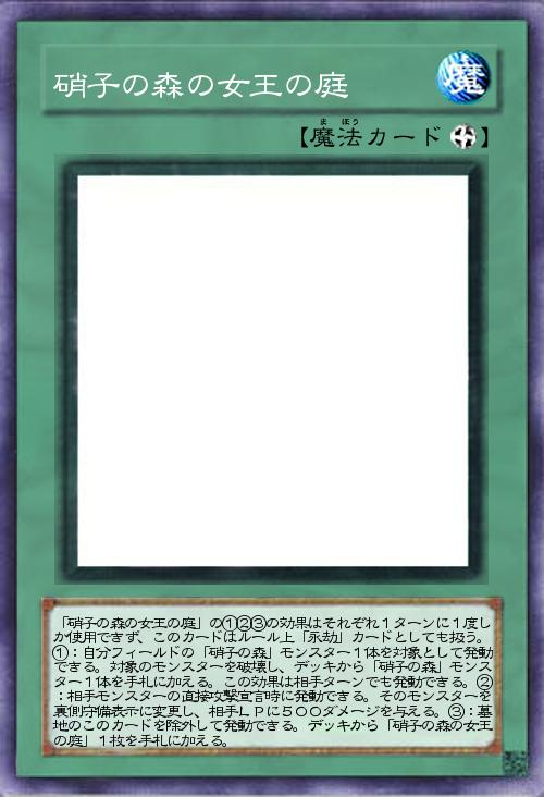 | 「硝子の森の女王の庭」の①②③の効果はそれぞれ1ターンに1度しか使用できず、このカードはルール上「永劫」カードとしても扱う。①:自分フィールドの「硝子の森」モンスター1体を対象として発動できる。対象のモンスターを破壊し、デッキから「硝子の森」モンスター1体を手札に加える。この効果は相手ターンでも発動できる。②:相手モンスターの直接攻撃宣言時に発動できる。そのモンスターを裏側守備表示に変更し、相手LPに500ダメージを与える。③:墓地のこのカードを除外して発動できる。デッキから「硝子の森の女王の庭」1枚を手札に加える。 | |||