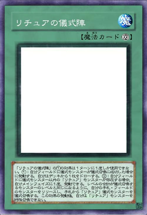 | 「リチュアの儀式陣」の①の効果は1ターンに1度しか使用できな い。①:自分フィールドに儀式モンスターが儀式召喚に成功した場合に発動する。自分はデッキから1枚をドローする。②:自分フィールドに儀式モンスター以外の「リチュア」モンスターが存在する場合、自分メインフェイズに1度、発動できる。レベルの合計が儀式召喚するモンスターのレベルと同じになるように、自分の手札・フィールドのモンスターをリリースし、手札から「リチュア」儀式モンスターを儀式召喚する。この効果の発動後、自分は「リチュア」モンスターを特殊召喚できない。 | |||