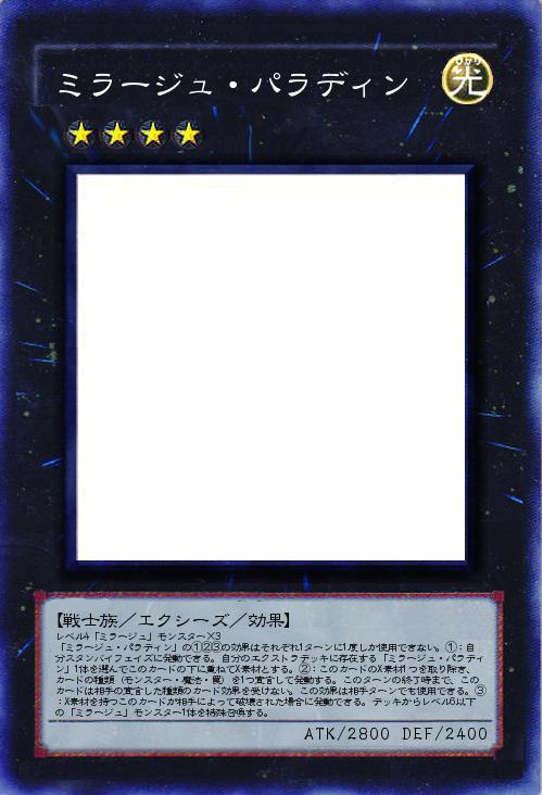 | レベル4「ミラージュ」モンスター×3 「ミラージュ・パラディン」の①②③の効果はそれぞれ1ターンに1度しか使用できない。①:自分スタンバイフェイズに発動できる。自分のエクストラデッキに存在する「ミラージュ・パラディン」1体を選んでこのカードの下に重ねてX素材とする。②:このカードのX素材1つを取り除き、カードの種類(モンスター・魔法・罠)を1つ宣言して発動する。このターンの終了時まで、このカードは相手の宣言した種類のカード効果を受けない。この効果は相手ターンでも使用できる。③:X素材を持つこのカードが相手によって破壊された場合に発動できる。デッキからレベル6以下の「ミラージュ」モンスター1体を特殊召喚する。 | |||