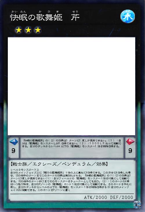 | レベル3モンスター×2 自分のメインフェイズ2に「眠りの歌舞姫芹」1体の上に重ねてX召喚できる。この方法でX召喚した場合、次の相手のターンまでこのカードの効果は無効化される。「快眠の歌舞姫芹」の(1)(2)の効果は1ターンに1度しか使用できない(1):自分フィールドの「歌舞姫」モンスター1体を対象にして発動できる。次の相手のターン終了までそのモンスターをチューナーとしても扱う。(2):このカードのX素材一つ取り除き、自分のPゾーンの「歌舞姫」カード1枚を対象にして発動できる。そのカードを手札に戻し、自分のデッキからレベル6以下の「歌舞姫」モンスター1体を特殊召喚する(3)自分のメインフェイズ2に発動できる。このカードをPゾーンに置く | |||
