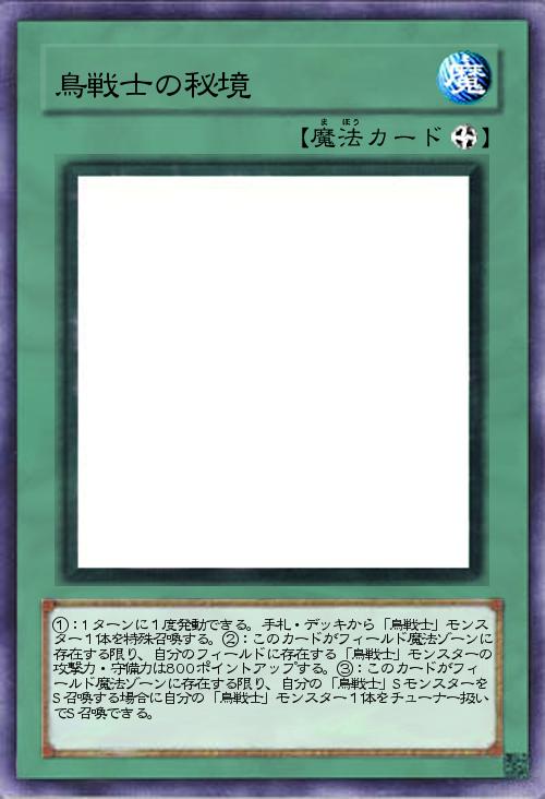 | ①:1ターンに1度発動できる。手札・デッキから「鳥戦士」モンスター1体を特殊召喚する。②:このカードがフィールド魔法ゾーンに存在する限り、自分のフィールドに存在する「鳥戦士」モンスターの攻撃力・守備力は800ポイントアップする。③:このカードがフィールド魔法ゾーンに存在する限り、自分の「鳥戦士」SモンスターをS召喚する場合に自分の「鳥戦士」モンスター1体をチューナー扱いでS召喚できる。 | |||