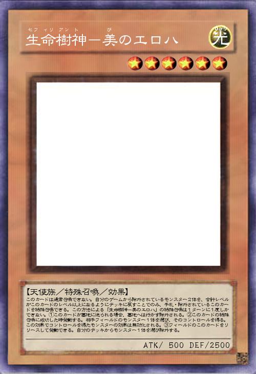 | このカードは通常召喚できない。自分のゲームから除外されているモンスター2体を、合計レベルがこのカードのレベル以上になるようにデッキに戻すことでのみ、手札・除外されているこのカードを特殊召喚できる。この方法による「生命樹神-美のエロハ」の特殊召喚は1ターンに1度しかできない。①このカードが墓地に送られる場合、墓地へは行かず除外される。②このカードの特殊召喚に成功した時発動する。相手フィールドのモンスター1体を選び、そのコントロールを得る。この効果でコントロールを得たモンスターの効果は無効化される。③フィールドのこのカードをリリースして発動できる。自分のデッキからモンスター1体を選び除外する。 | |||