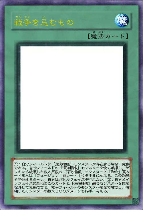 | ①:自分フィールドに「深海棲艦」モンスターが存在する場合に発動できる。自分フィールドの「深海棲艦」モンスターを全て破壊し、デッキから破壊した数と同数の「深海棲艦」モンスターと「融合」罠カードまたは「フュージョン」罠カード1枚を手札に加える。この効果を発動するターン、自分はバトルフェイズを行えない。②:自分メインフェイズに墓地のこのカードと「深海棲艦」融合モンスター3体を除外して発動できる。相手フィールドのモンスターを全て破壊し、破壊したモンスターの数×800ダメージを相手に与える。 | |||
