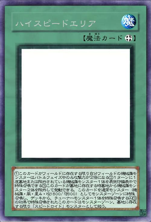 | ①このカードがフィールドに存在する限り自分フィールドの機械属モンスターはバトルフェイズ中のみ攻撃力が2倍になる②1ターンに1度墓地または除外されている機械属モンスター1体を表側守備表示で特殊召喚できる③このカードが墓地に存在する時墓地から機械属モンスター2体を除外して発動できる。このカードを通常モンスター(機械属・風・星4・攻1800/守300)としてモンスターゾーンに特殊召喚し、デッキから、チューナーモンスター1体を特殊召喚する④③の効果で特殊召喚されたこのカードはモンスターゾーン、墓地に存在する限り「スピードロイド」モンスターとして扱う。 | |||