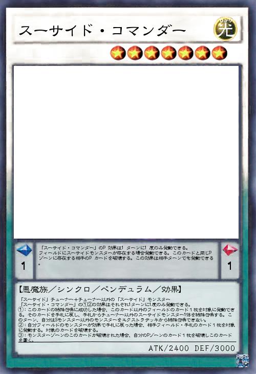 | 「スーサイド」チューナー+チューナー以外の「スーサイド」モンスター 「スーサイド・コマンダー」の①②の効果はそれぞれ1ターンに1度のみ発動できる。 ①:このカードの特殊召喚に成功した場合、このカード以外のフィールドのカード1枚を対象に発動できる。そのカードを手札に戻し、手札からチューナー以外のスーサイドモンスター1体を特殊召喚する。このターン、自分はSモンスター以外のモンスターをエクストラデッキから特殊召喚できない。 ②:自分フィールドのモンスターが効果で手札に戻った場合、相手フィールド・手札のカード1枚を対象に発動する。対象のカードを破壊する。 ③:モンスターゾーンのこのカードが破壊された場合、自分のPゾーンのカード1枚を破壊しこのカードを置く。 | |||