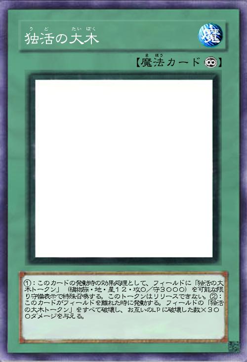 | ①:このカードの発動時の効果処理として、フィールドに「独活の大木トークン」(植物族・地・星12・攻0/守3000)を可能な限り守備表示で特殊召喚する。このトークンはリリースできない。②:このカードがフィールドを離れた時に発動する。フィールドの「独活の大木トークン」をすべて破壊し、お互いのLPに破壊した数×300ダメージを与える。 | |||